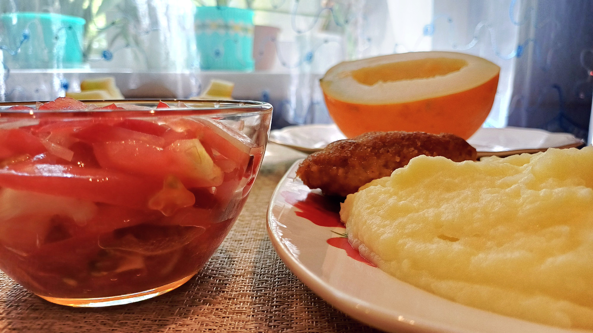 - Салат из помидоров: Сочетание помидоров с репчатым луком, заправленный растительным маслом и немного посоленный сделает это блюдо настоящим угощением.