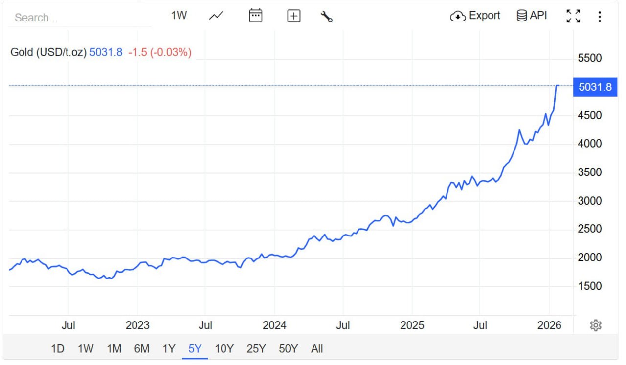Цены на драгоценные металлы достигли рекордных значений. На бирже Comex фьючерс на золото впервые в истории превысил психологически важную отметку в $5000 за тройскую унцию, достигнув уровня в $5027,3. Одновременно с этим серебро впервые преодолело рубеж в $105 за унцию, позже закрепившись на отметке $104,5.