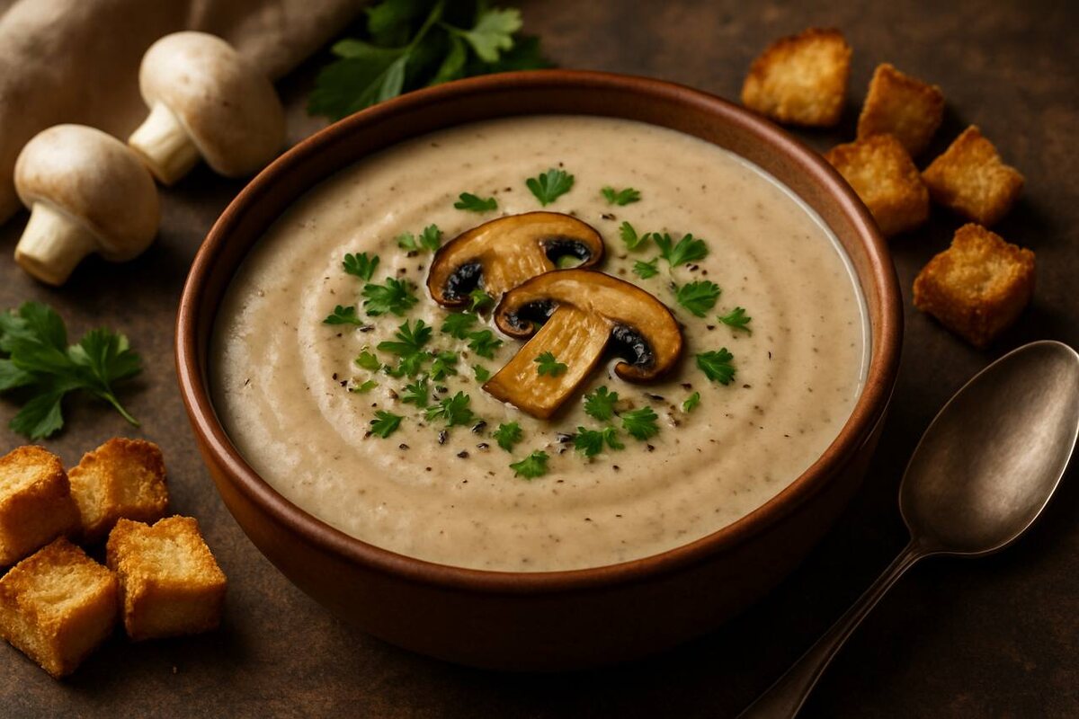 Грибной суп-пюре — это не просто обычный суп, а невероятно нежное и сливочное лакомство с глубокими оттенками вкуса. В каждом глотке ощущается обжаренный лук и лёгкая землянистая нотка лесных грибов, которые создают текстуру, будто обволакивающая, как облако.