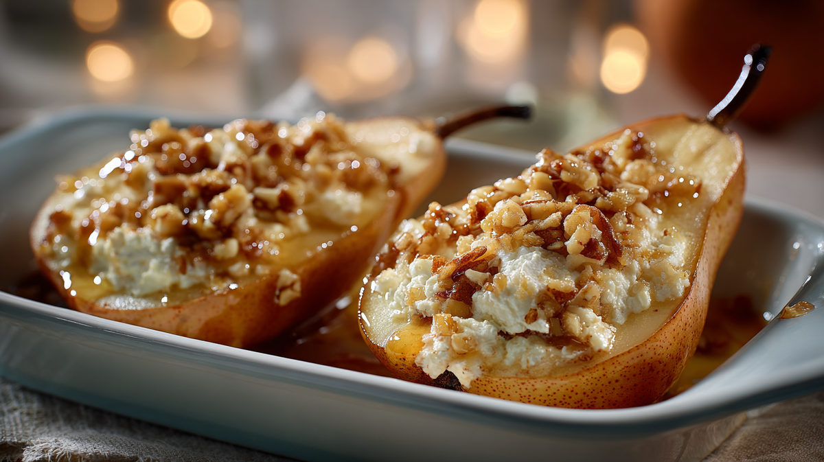 Ингредиенты: 2 груши, 120 г творога, 1-2 ч. л. меда, ваниль, орехи.