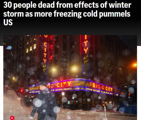 30 человек погибли из-за зимнего шторма в США, миллионы остались без света.