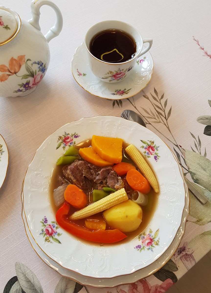 Подача напоминает праздничный, но домашний обед: разложить мясо и овощи по тарелке, добавить бульон отдельно или сразу полить. К блюду подойдут тортильи и свежий хлеб — чтобы поглощать насыщенность вкусов без лишних усилий.
