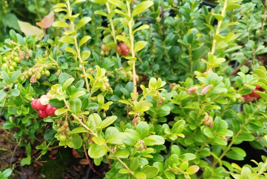 Брусника садовая — вечнозеленый кустарник с маленькими блестящими листами и крохотными бело-розовыми цветками, за которыми следуют ярко-красные ягоды. В условиях сада современные сорта дают крупнее ягоды и устойчивее к переменам погоды, оставаясь декоративными на протяжении всего сезона.
