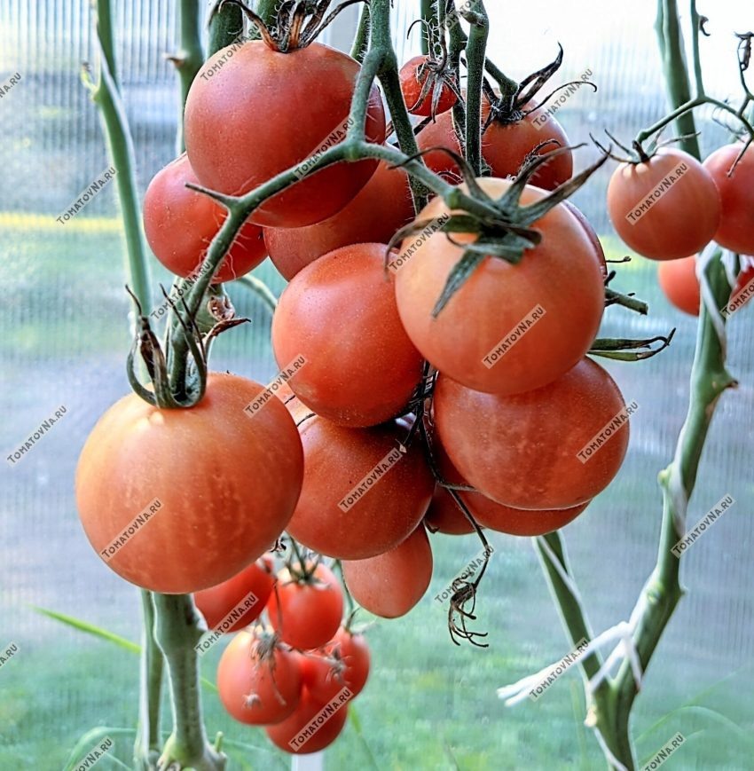 Куст достигает высокой высоты и нуждается в опоре. Плоды равномерно окрашиваются до коричнево?фиолетового оттенка, сохраняют форму при консервации и при переработке дают густую массу. Мякоть красная и мясистая, семян немного, что облегчает использование для паст и соков.