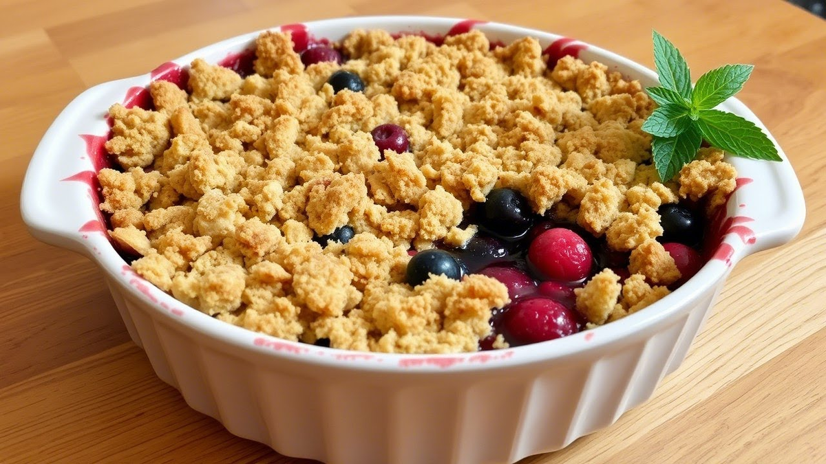 Ягоды, щедро посыпанные семенами чиа и подсластителем по вкусу, размещаются поверх крошки, после чего блюдо отправляется в духовку. Небольшой тёплый аромат заполняет кухню за считанные минуты, а на тарелке десерт выглядит уютно и аппетитно.
