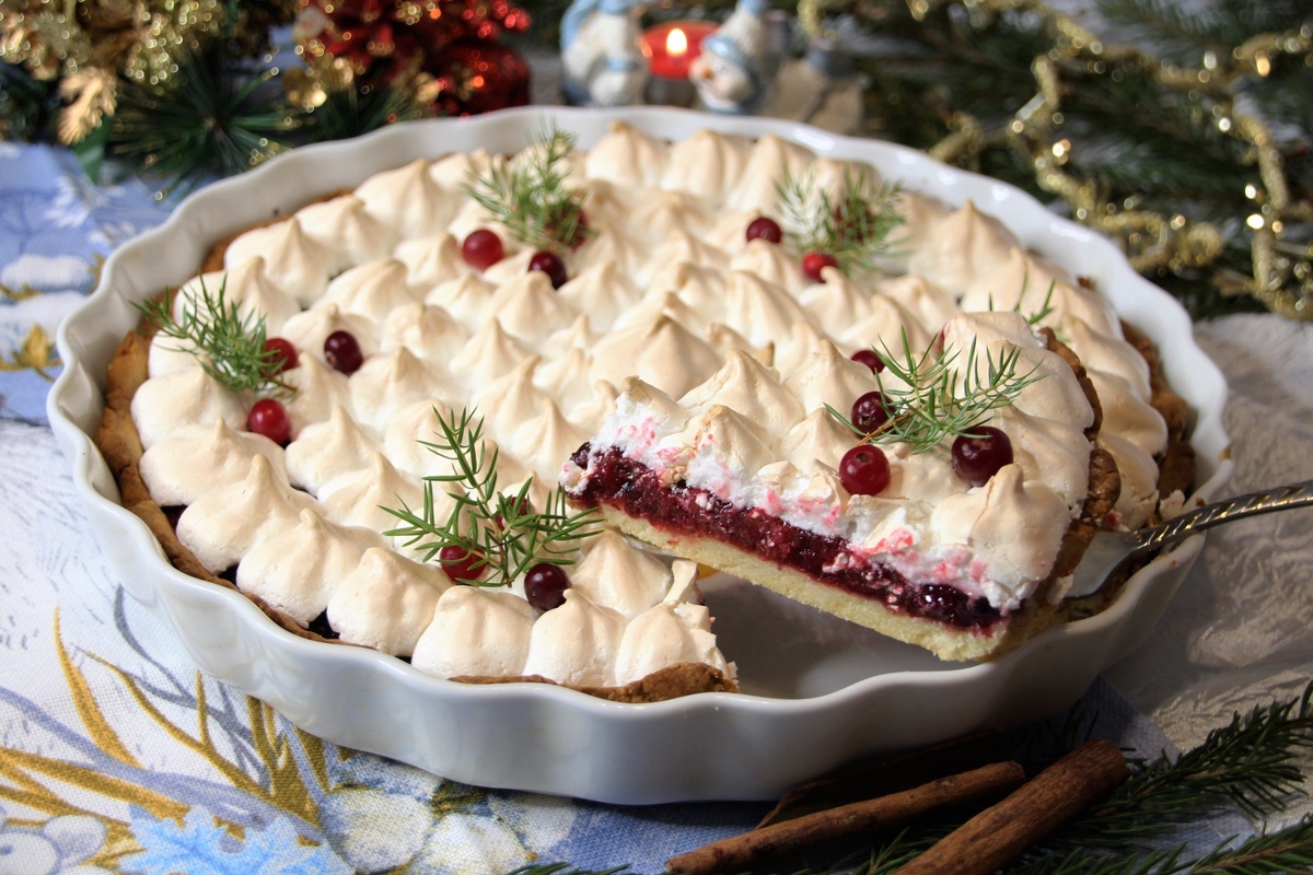 Основа — песочное тесто, которое держит форму и не требует особого ухода. В начинку идут клюква, сахар и лёгкий крахмал, чтобы сохранить естественную кислинку и придать ей лёгкую густоту. Верх дополняет меренга: воздушная и сладкая, она не перегружает вкус, а подчеркивает каждую ноту ягодной прослойки.