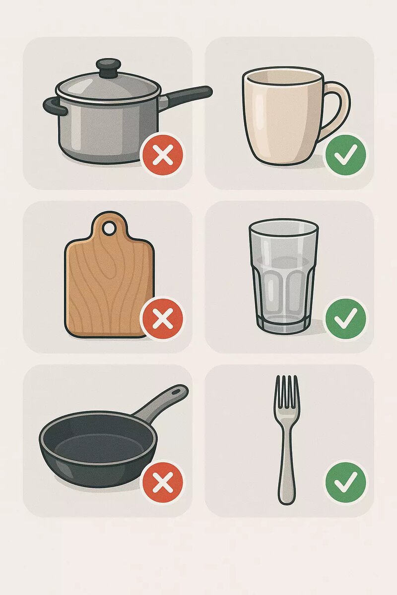 Есть группа предметов, которые автоматике противопоказаны: деревянные изделия (доски, ручки), чугун с приправленной поверхностью, медь и алюминий, старинный хрусталь и предметы с позолотой, термокружки с вакуумной камерой, посуда с ручной росписью и пластик без маркировки для ПММ. Мойка таких вещей приводит к необратимым повреждениям и даже выделению вредных веществ.