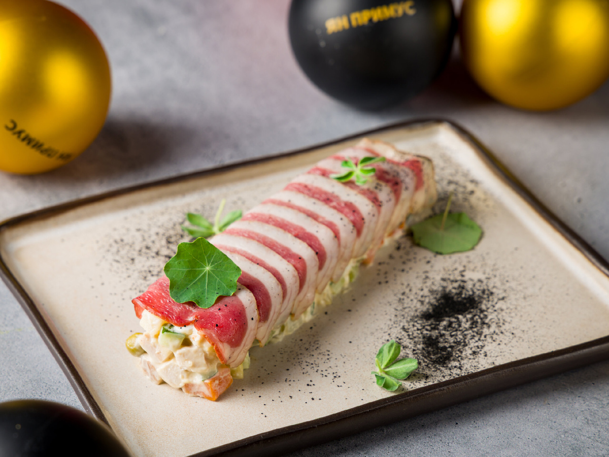 Оливье по?новому: утка и запечённые овощи превращают классику в ресторанное блюдо