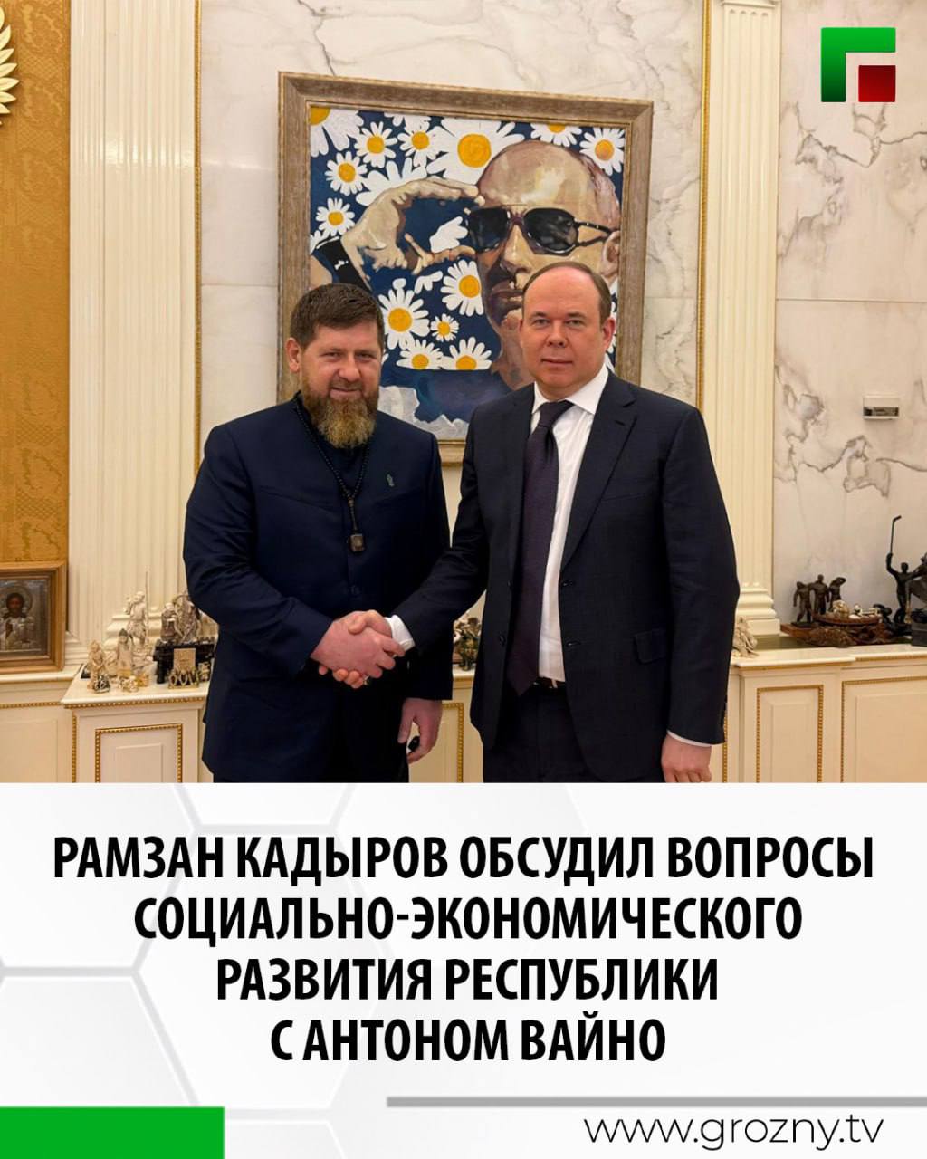У Главы Чеченской Республики состоялась рабочая встреча с Руководителем Администрации Президента Российской Федерации Антоном Вайно. Об этом Рамзан Кадыров сообщил в своем телеграм-канале.