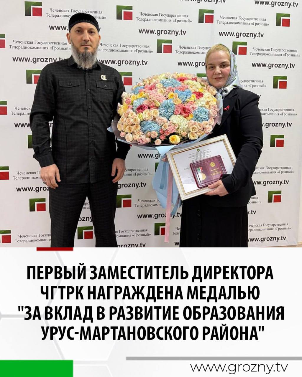 Первый заместитель директора ГБУ ЧГТРК "Грозный" Хайзуран Мадаева награждена медалью "За вклад в развитие образования Урус-Мартановского района". Награду вручил начальник отдела образования Урус-Мартановского муниципального района Саид Айдамиров.