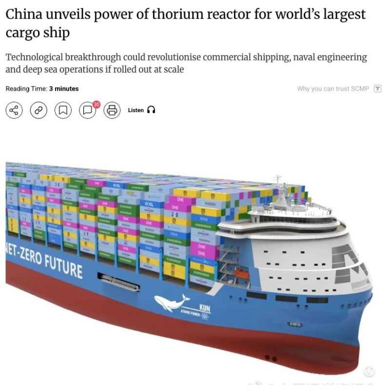 Согласно данным South China Morning Post, Китай проектирует атомный контейнеровоз нового поколения, способный перевозить 14 000 стандартных контейнеров. Судно будет оснащено инновационным реактором на основе расплавленной соли тория (TMSR)...